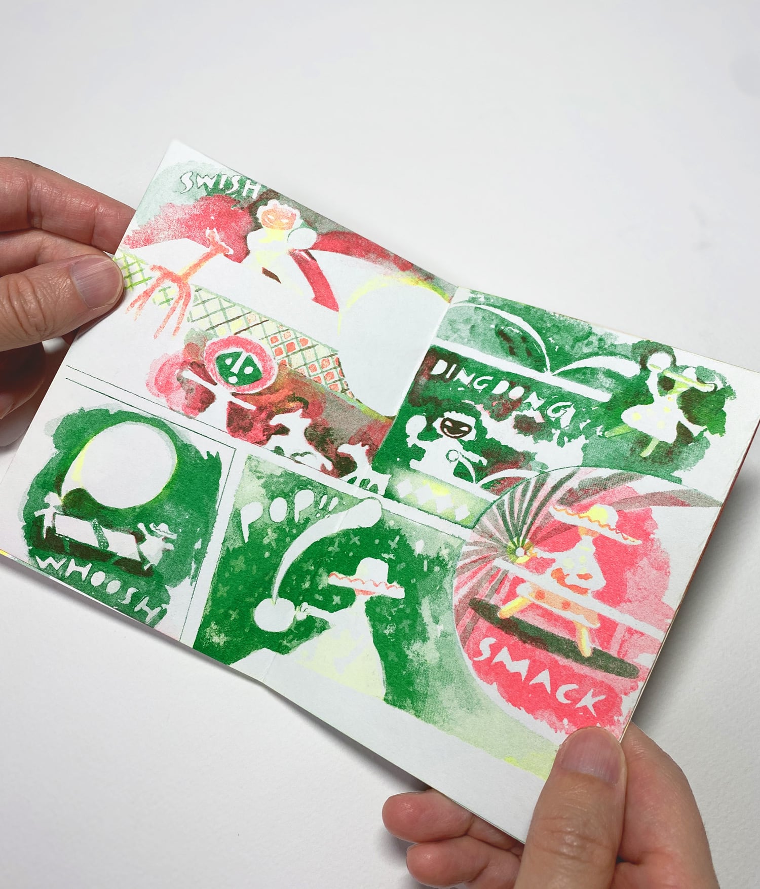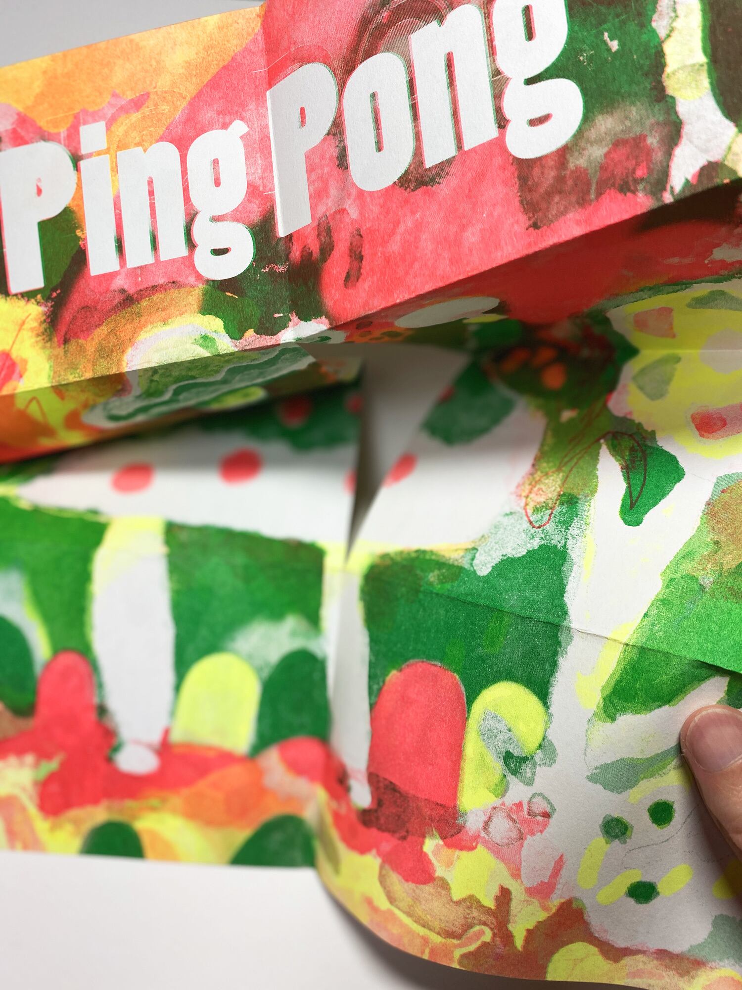 カラフルな色使いで、書籍、広告、ファッション、CMなど、様々な媒体の仕事を手掛ける下平晃道(Murgraph)のドローイングブック。ピンポン(卓球)をテーマに、ボールがのびのびとコートを跳ね、色彩の中を漂う様子を描いている。A3サイズの用紙を折りたたんで作られた6ページの本で、広げると裏面に大きな絵が描かれていてポスターにもなる。